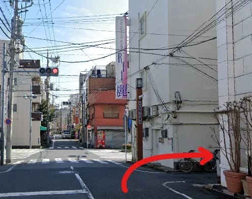 信号前、ソープ麗の裏の路地を右に曲がります。