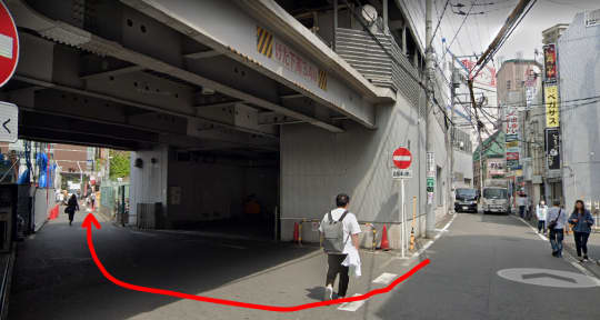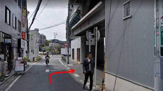 ここを右に曲がり、高架線の下を通り抜け、向こう側の道路へ行きます。