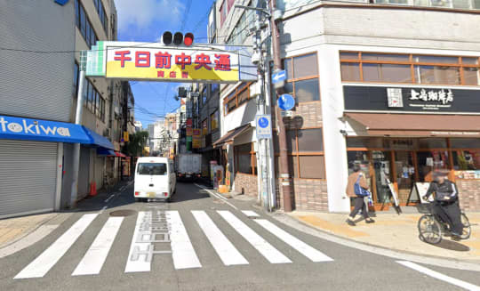 右に曲がるところは「千日前中央通り」の看板がありますので、こちらを真っすぐ進んでください。