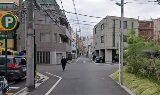 こちら左側に「コインパーキング」がある十字路を、画像右に曲がってください。