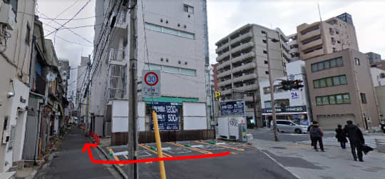 横断歩道を渡り切ったところの建物を、すぐ右へ曲がります。