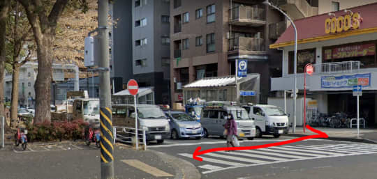 逆に横断歩道を渡ったら、すぐ右へ曲がっても行くことは可能です!