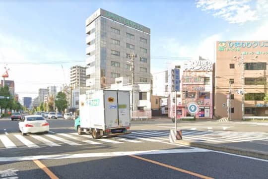 則武新町の交差点を渡ります。斜め前方、国際医学技術専門学校の前を通り過ぎてください。あと少しです。