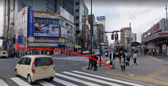 駅前の横断歩道を渡り、矢印方面で歩きます。