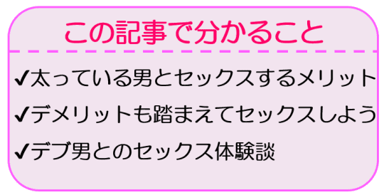 あなたはデブ男とsexをしたことがありますか?私は歴代彼氏の8割がデブ男!(笑)色んなデブ男とsexしてきました。そんな私がデブ男とのsexの魅力をお伝えします。デブ男の良さを知らないのは勿体無い!これを知ればあなたもデブ男とsexしたくなること間違いなし!
