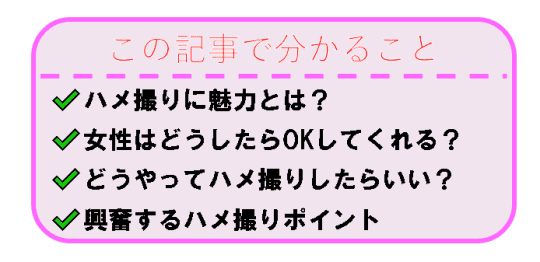 ハメ撮りはセックスしているところを撮影することです。男性なら一度はしてみたいと思ったことがあるかもしれませんね。実は私もハメ撮りを経験したことがあります。ハメ撮りの方法だけでなく、女性がどうしたらハメ撮りをOKしてくてくれるのかや興奮ポイントなどを説明します。