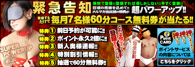 なんと「毎月7名様60分コース無料券」が当たっちゃいます!(驚)。その他の特典は「前日予約可能」「ポイント永久2倍」「新人奥様速報」「特別割引情報」など、会員になっておかないと損です(汗)。