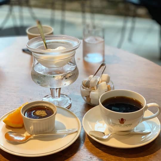 続いてご紹介するカフェは、「FUKATSU COFFEE 則松」です。ここは雑居ビルの2階とは思えないような開放的な空間が魅力的で、黒ごま百景プリンが人気。
