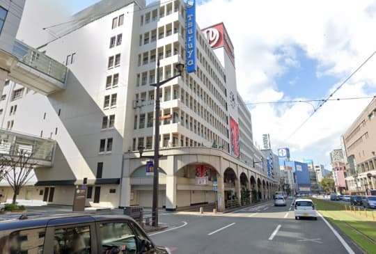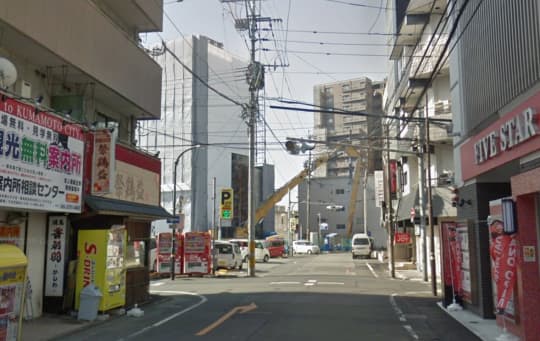 暫く進むと6本目の十字路。左側に「熊本観光無料案内所」、右側に「FIVE STAR」の看板が見えますのでそこを右に曲がってください。