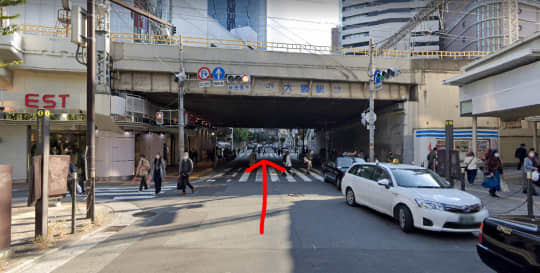 高架線の下を通り直進、1つ目の信号を左へ。