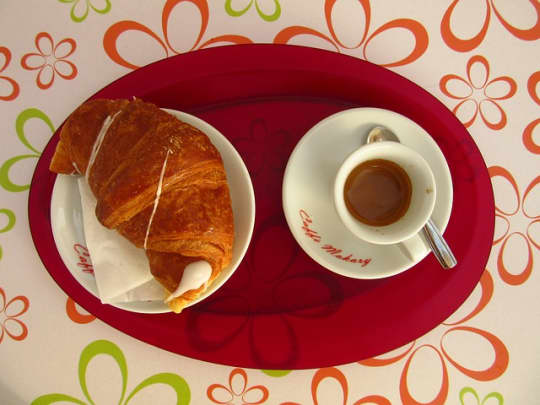 イタリア人の朝食はカプチーノとクロワッサンが定番。バールだと2点合わせて2.5ユーロ(約300円)ほどです!カウンターでささっと食べて足早に出ていくのがイタリア式。テーブル席もありますが、お店によってはサービス料がかかる場所もあります。