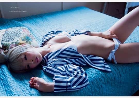 はっきりいってこれ以上の「最上もが」の「セクシーさとエロさ」を感じさせる「エロ画像」は私にとってはないと断言できます!ベッドに横になっている「最上もが」の何か思いつめたような表情と、その「ストライプのシャツ」に「白い水着」から「最上もが」のある意味象徴ともいえる「大きなおっぱい」の盛り上がりに、私の股間も連動して盛り上がってしまいそうです!