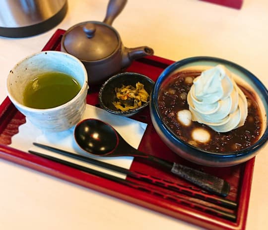 ここでは「あんみつセット」を注文しましたが、抹茶ソフトは甘さが控えめで抹茶の風味を強く感じ、白玉は味付けされていないものの、しっかりと弾力もあってあんことマッチしていました!