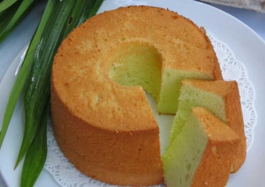 みなさんこのケーキをみたことがありますか?日本ではあまりなじみがないですね。実は、シンガポールで人気なんです。葉っぱを絞って作られるため、このような色になります。優しい味わいで、ふわふわです。みなさんもきっとクセになりますよ。