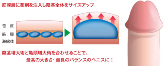 こちらは、陰茎の皮膚と筋膜の間に薬剤を注入し、ペニスのサイズアップを行う方法です。