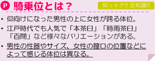 女性が上になることで子宮が重力で下まで降りてくるので奥まで刺激しやすい体位です。