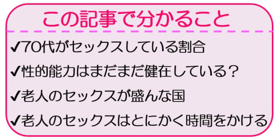 70歳代でも週に数回のセックスをし、80歳代や90歳代でも愛撫だけではなく挿入をするセックスをしているという事です。