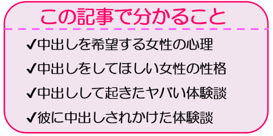 男性の皆さん!セックス中にアナタがもし相手の女性に「中に出していいよ」と言われたらどうしますか??しかもそれがゴムをつけていない場合だったら...アナタは決断できますか??今回はそんな台詞を口にする女性の心理と隠れた危ない性格について解説していきます♪