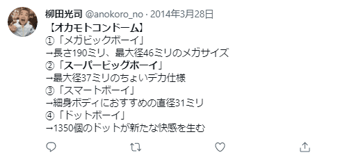 オカモト商品の中で、最大のコンドームがメガビッグボーイです。
