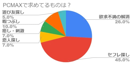 大人関係に特化しているだけあって、やはりセフレ探しが一番多い結果となりました。ちなみに男女半々くらいの割合で「セフレ目的」として、多くの女性がPCMAXでセフレをみつけています♪