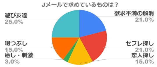 その為、上記のグラフの通し、「暇つぶし」「遊び友達」目的で登録している男性が多いのもJメールです!