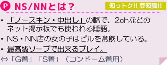 ソープではG着(ゴム着)でプレイするお店が90%以上。基本的に吉原・金津園・福原などの有名ソープ街の高級店でのみNN/NSプレイを黙認しています。