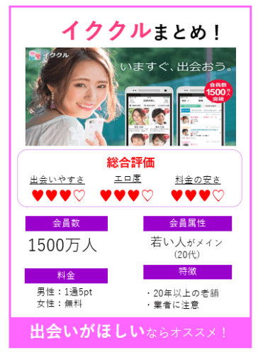 https://www.194964.com/LP/hd/01.php?id=14680イククルは出会い系サイトとして名前があまり浸透していませんが、1500万人以上の会員数で地方の方も比較的出会いやすいです!