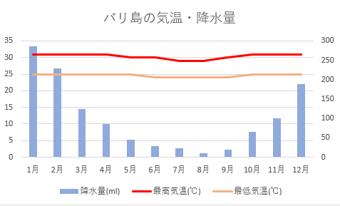 オーストラリアのすぐ北に位置する熱帯気候のバリ島は、年間の平均気温は約28℃。四季はなく、年中基本的に暖かい気候です。