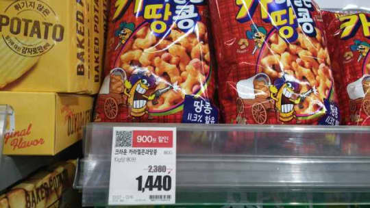 この商品も日本の商品とよく似ていますが、キャラメルコーンピーナッツと書いてあるので、日本の商品とは少し名前が違います。この商品も比較すると、会話が盛り上がって楽しいでしょう。価格は1440ウォン(約144円)でした。