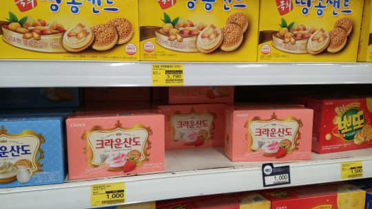 お菓子売り場でひときわ目を引く、可愛いピンクのパッケージに、ずっと気になっていた人も多いと思います。可愛らしいパッケージ同様、中身も期待を裏切りません。ストロベリークリムチーズ味が程よい甘さで、美味しいです。価格は7袋入っていて、1000ウォン(約100円)でした。