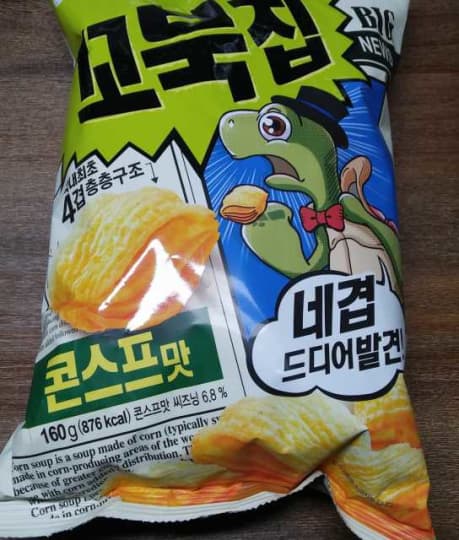 韓国のお土産に、インスタ映えを意識したお土産はいかがでしょうか。オリオンの亀チップは、インパクト大の韓国らしいデザインなので、韓国のお土産には丁度良いお菓子だと思います。実際に中身を食べてみると、パッケージ通りのコーンポタージュ味がほのかにします。量は多いのですが、軽い口当たりで一気に全部食べきれます。韓国では20代前半の男子に、人気があるお菓子です。価格は2270ウォン(約227円)でした。