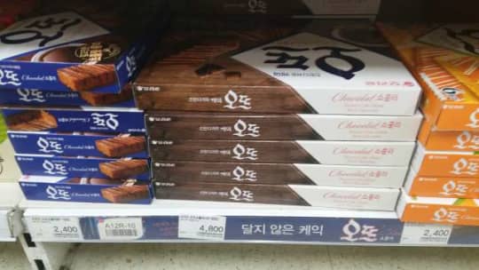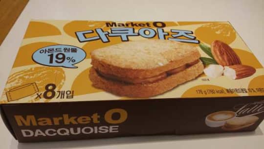 オリオンのマーケットオーはブラウニーで有名だと思いますが、今年の春に発売されたマーケットオーシリーズのダクワーズは、韓国でじわじわと人気が出てきています。ブラウニーの次に、このお菓子が日本で流行ってもおかしくないでしょう。12個入りで価格は5980ウォン(約598円)でした。