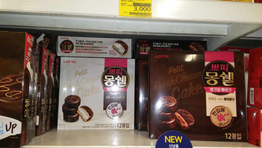 韓国のお土産として購入する時に、やはり韓国での売れ行きが気になる人もいると思います。この写真は、スーパーのお菓子売り場で陳列されていた、ロッテのプチモンシェルシリーズの写真です。韓国のスーパーはすぐ商品を補充しますが、ロッテのプチモンシェルシリーズは、商品を補充してもすぐ売れていきます。白い箱のプチモンシェルクリームバニラビーンズ味の隣にある、ダークブランの箱の商品はカカオヘーゼルナッツ味です。この商品も美味しいので売れています。