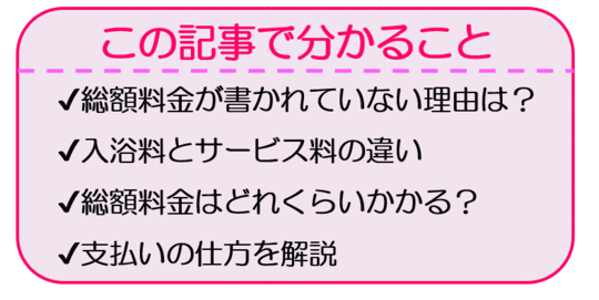 『入浴料』と書かれている場合はその他に『サービス料』がかかるので、実際に総額で支払う料金は更に跳ね上がるのです。
