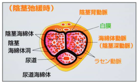 一方、体内では一酸化窒素が放出され血管に血液が流れ込み、血液の圧力によって海綿体が硬くなります。