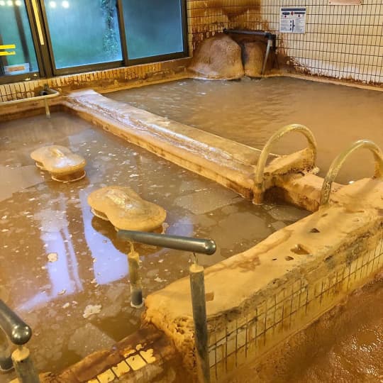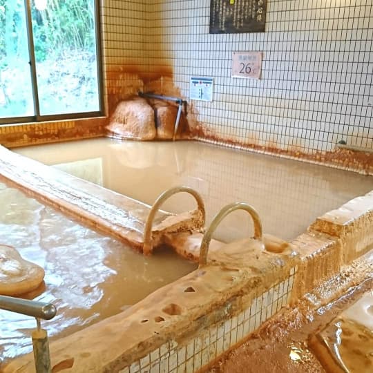 カルシウムの膜が張るほど成分の濃い名湯です。炭酸泉なのに鉄分を含有しているという珍しいお湯。
