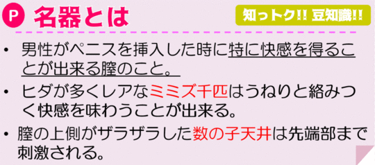 「名器」とは、男性が挿入した時に、感じが良くて気持ちが良い「膣内」の事を指します。