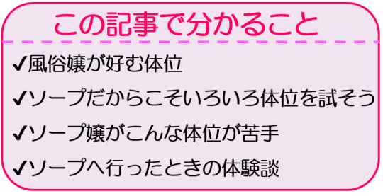 好きな体位もあれば、嫌いな体位もあるでしょう。本項目ではソープ嬢らが好きな体位について3つ紹介します。