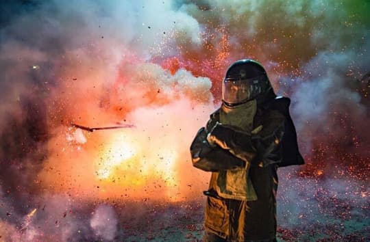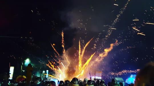 火花が飛びまくりで危ないので、みんなが逃げ惑う、というとそういうわけではなく、火花に当たると無病息災になると言われてこぞって火花を浴びに行きます。