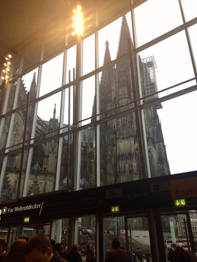 そして、電車を降りて駅内の出入り口窓からもその迫力が。よくもこんな真横に中央駅(もちろん大きい駅です)を建てたなと思いつつも、電車から徐々に見え始めるケルン大聖堂の迫力を楽しんでほしいからなのだろうかとも思いますが....歴史的建造物の周辺の外観を大切にするヨーロッパではとても珍しいケースです。