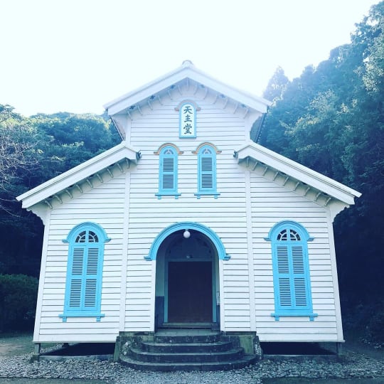 奈留島のおすすめの観光名所として、世界遺産に登録された「江上集落」には、「江上天主堂」があります。木造建築の白い壁と水色の窓が特徴的です。高温多湿な気候のため、高床式になっています。