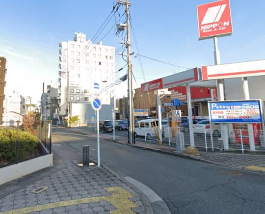 少し歩くと『ニッポンレンタカー』が見えてくるので、こちらの道を左に曲がりましょう。