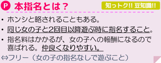 「本指名」とはいつも決まった女の子を指名することを言います。