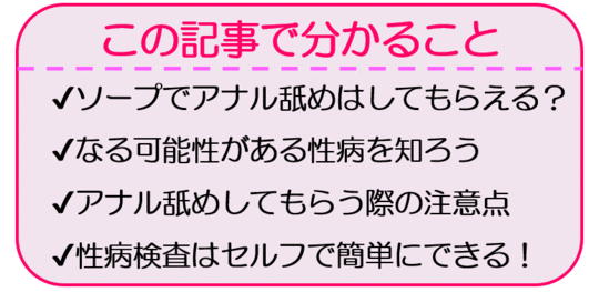 皆さんも、ソープでアナル舐めして貰えるのかしっかりと学び、性病に対しての理解も深めていきましょう!