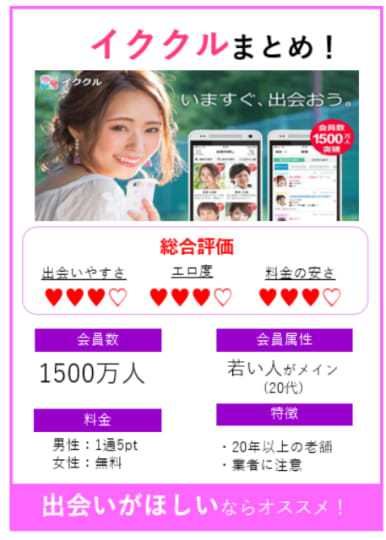 https://www.194964.com/LP/hd/01.php?id=14680イククルは、2000年から運営されており会員数は1500万人を超える大手出会い系アプリです。