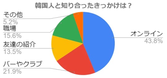こちらのグラフはSNSを使って韓国人と関係を持っている(恋人・セフレ・夫婦)女性100人に聞いた『韓国人と知り合ったきっかけ』を聞いた結果です。
