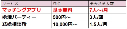 上記の表は通常の出会い方である、婚活パーティー・結婚相談所と比較したものです。