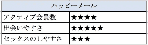 とはいえ、本気の出会いを探している人、割り切りで大人の関係の出会いを探している人など、両方に人気アプリです。評価はアクティブ勢・出会いやすさ・セックスのしやすさは共に100点満点!