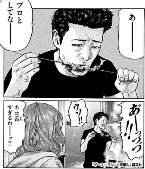 熱いものを食べる時は、同じ組織『ファブル』にいる、ボスに佐藤の妹役として『ヨウコ』と名付けられた女に、フーフーしてもらわなければ食べられないほど!