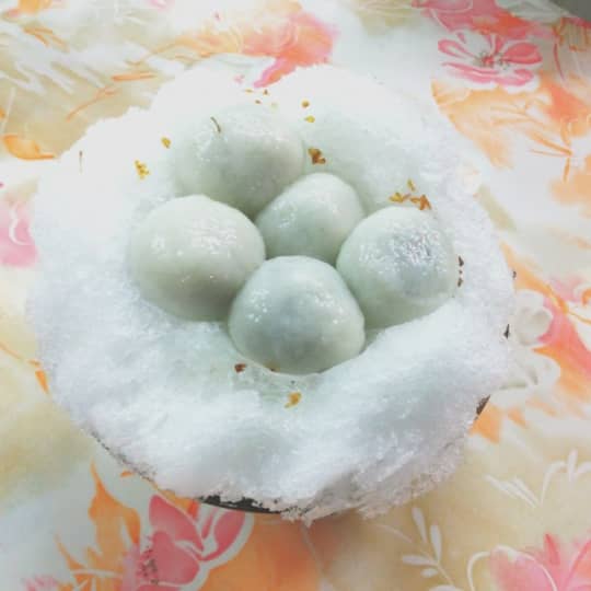 温かいものと冷たいものが選べますが、冷たいものは、かき氷の上に熱々の団子をトッピングするという斬新なスイーツ。さらに日本ではなかなか食べられない、金木犀を使ったシロップをかけます。ふわっと金木犀の優しい香りがして、団子ももちもちで美味しい!